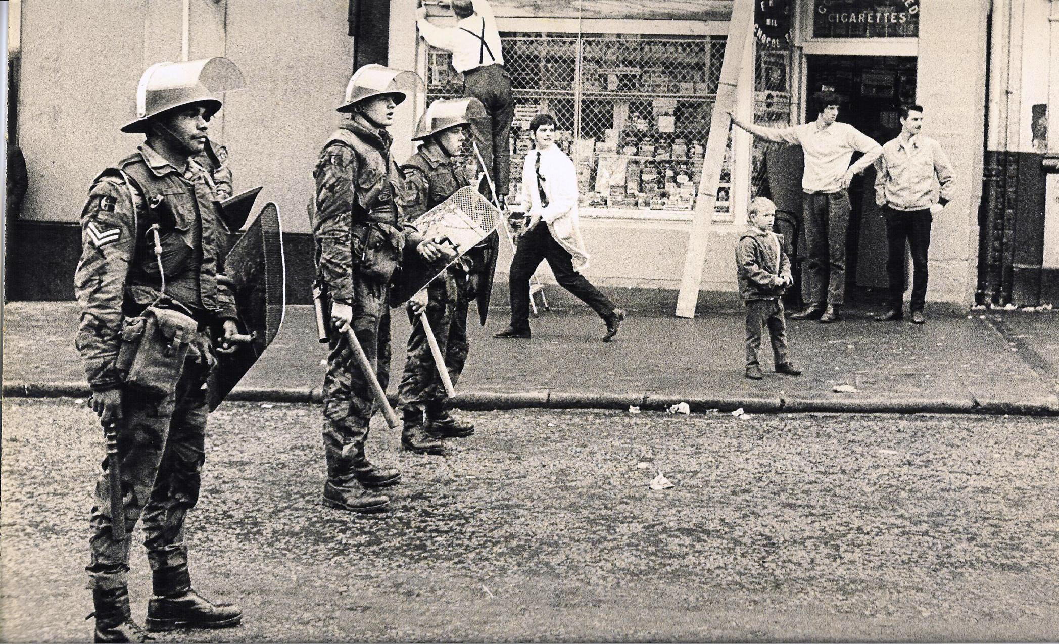 The armoured pigs and land rovers quickly filled with troops and moved onto the Shankill as the Linfield supporters, by now a full-blown rioting mob turned to the derelict buildings and began stoning on a prehistoric scale. Up raced the mob to the Shankill, vehicles began to burn, shops attacked.