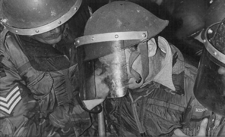 The riot soldiers were armed but under instructions not to open fire and the truth of it was that there was not enough soldiers and far too many rioters. Control could not be asserted and the rioting went on into the night and continued for about four days.. The Kings were holding a street known as Snugville Street, one of the maze of terraced houses that ran off the Shankill. We were under constant stoning mixed with occasional petrol bombs. Some rioters were using catapults and were firing marbles as well as stones. They bloody hurt and here a King’s Regt sergeant helps one of his men from the front line, badly hurt by a catapulted missile: