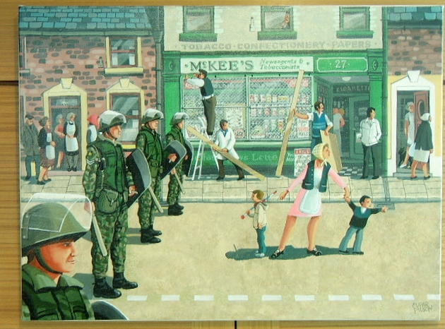 The painting, recently commissioned, is the artists interpretation of the photograph beneath the painting, taken on the Shankill Road in 1970 and referred to in the story at http://wp.me/p259Gc-1i