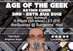 This show doesn’t really work. It hasn’t joined the dots together fully, which is a great pity, for the writing is absolutely first class. A real poet of the interweb. If he has a book of poems then I’d buy it and recommend it to anyone I know. I hope he sticks to it. He has a great touch in the writing not so great in the performance. Hayden Cohen. We shall undoubtedly be hearing more of him.