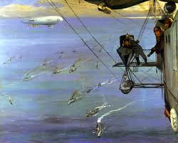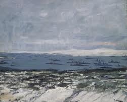I think he was wrong to disparage these war pictures. Some of his old colour and light from the Glasgow days reappears. The picture of the air-ship attacking submarines springs particularly to mind. And his painting of the submarines at Harwich is especially fine. He also painted some of the military camps and bases. His painting of the naval air station (for air-ships) at Queensferry must surely capture one of the first ever naval air stations. There is a very good portrait of a convoy sailor, an excellent interior of shell making by women workers in Edinburgh and a haunting landscape of ships lying at Scarpa Flow. There is also an excellent display of his portraiture skills in the painting on board HMS Elizabeth at the surrender of the German Fleet. Lavery specialised is such pictures, perhaps his most famous example being that of the appeal of Sir Roger Casement against a sentence of death for High Treason. (not in this exhibition but you can read about it here) In both instances he was present at the scene. On board HMS Elizabeth he dressed as a naval officer and hovered in the background behind a pot of flowers. In court he sat in the empty jury box preparing his sketches of the scene. Both are in fact fine war pictures.