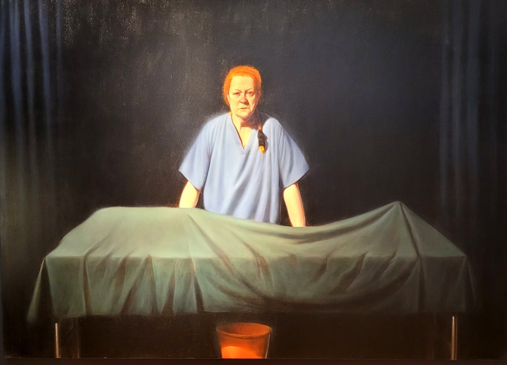 It captures Professor Black at the very height of her professional life, in surgical scrubs, in theatre, and what a theatre, about to lift the covers on the body of the unknown man and commence her work of identifying the cause of death, was it by natural causes, negligence, foul play or by his own hand.