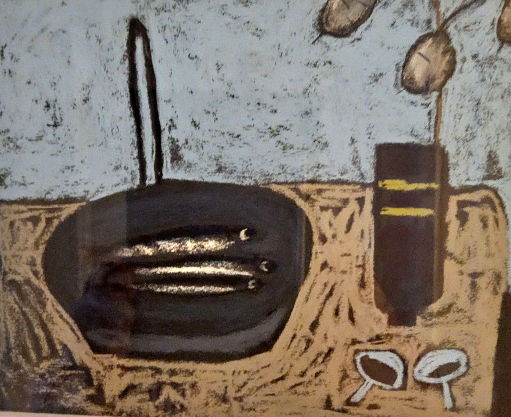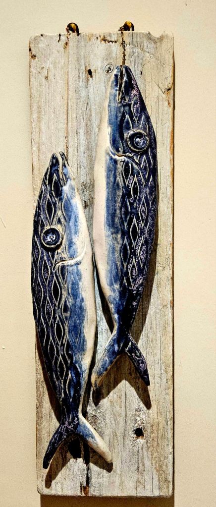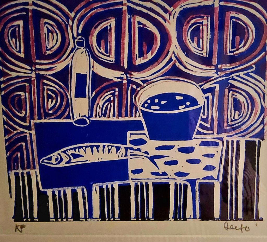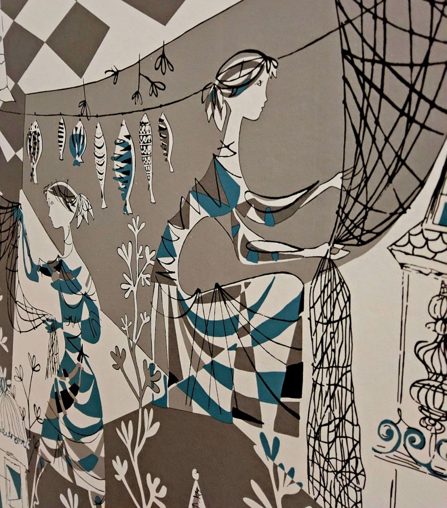 There are quite a lot of references to fish and the sea, original paintings, sculptures, pottery, cookbooks, even the splash tiles over the kitchen sink are configured to represent the ocean. And in the utility room wallpaper depicting scenes from a fishing village with fishwives tending the nets and hanging out the fish to dry.
