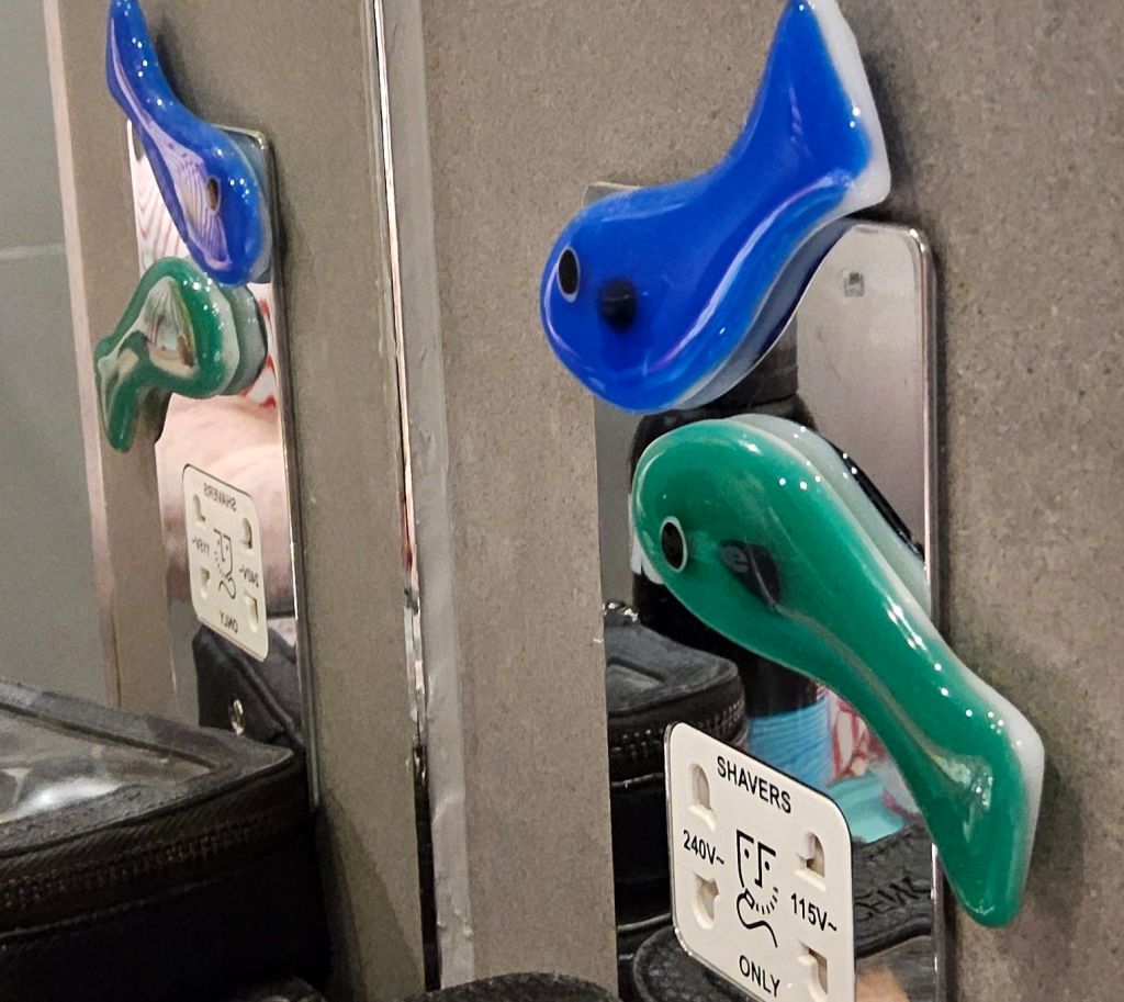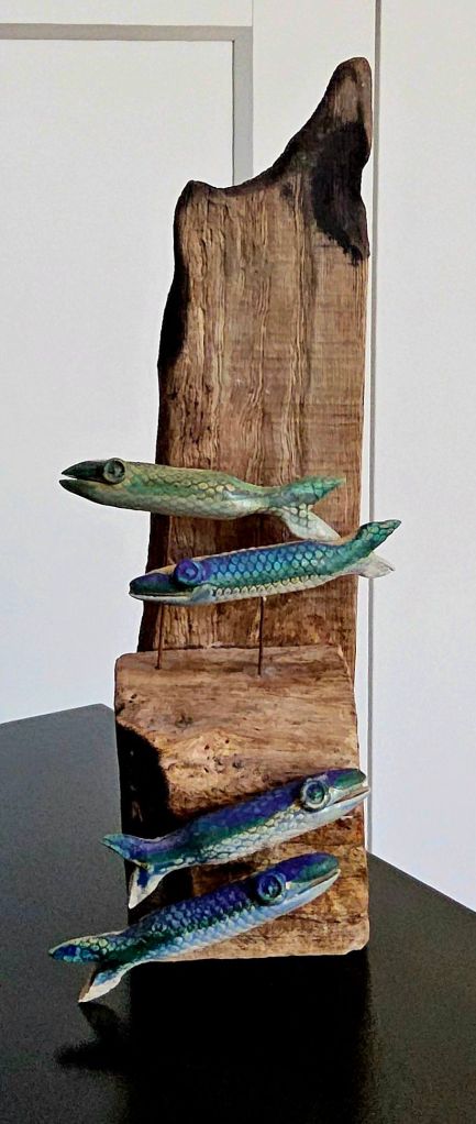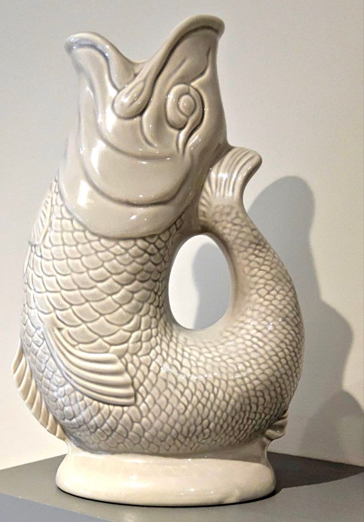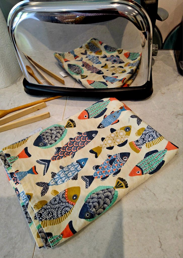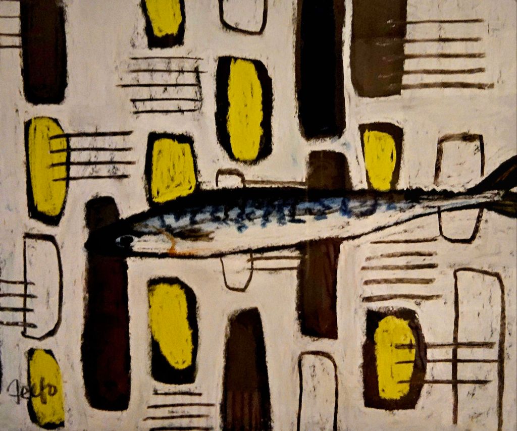 There are quite a lot of references to fish and the sea, original paintings, sculptures, pottery, cookbooks, even the splash tiles over the kitchen sink are configured to represent the ocean. And in the utility room wallpaper depicting scenes from a fishing village with fishwives tending the nets and hanging out the fish to dry.